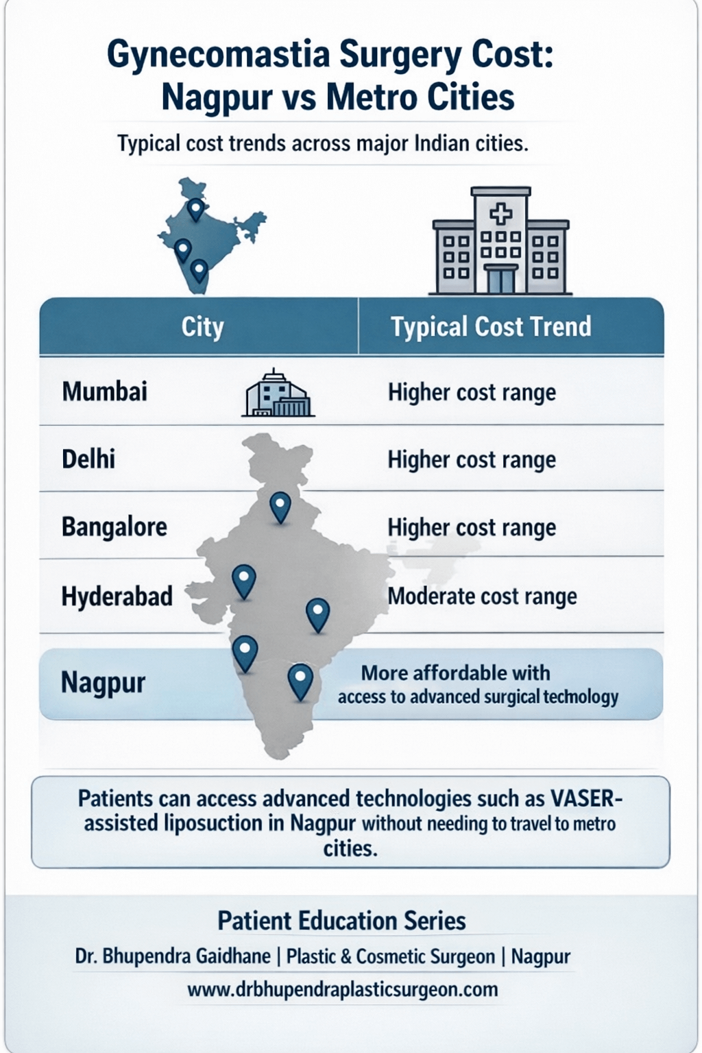 Earlier, patients believed they had to travel to metro cities such as Mumbai or Delhi for advanced cosmetic surgery. Today, Nagpur offers modern technologies such as VASER-assisted liposuction at comparatively lower cost due to lower institutional overheads.